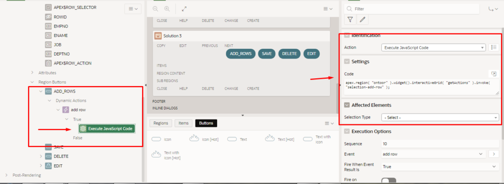- Create dynamic action on click ADD_ROWS button and execute following script.