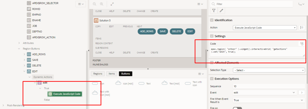 But the question is that why we should create custom buttons when we have the default buttons enabled for an Interactive Grid in Oracle APEX? We never know what kind of a requirement can come from the client for customization and then we have to create custom button to take more control over it, To create this custom button follow these below steps: