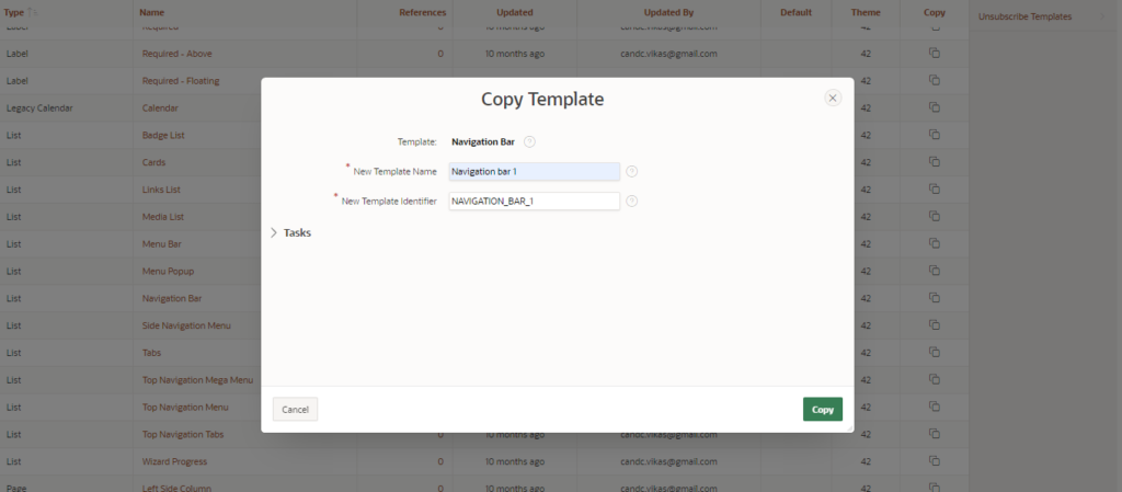 - First go to the Share Components»Templates and copy the navigation bar tamplate and give the another name.