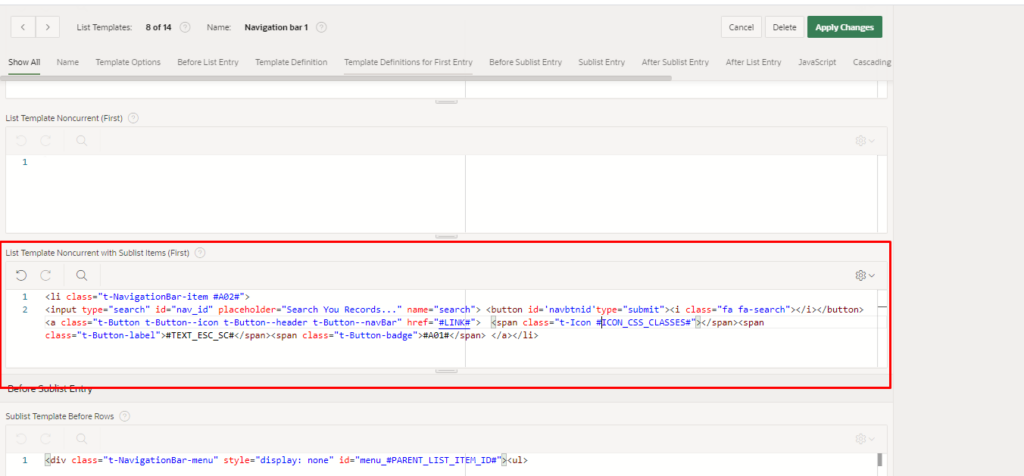 - Now Open the New navigation bar which you have created and go to the List Template Noncurrent with Sublist Items (First) and paste the below code as per screenshot.