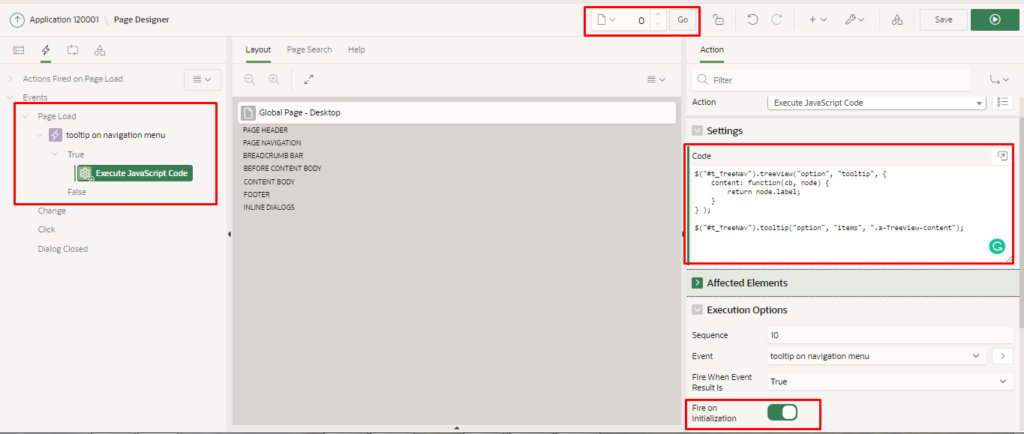 - Select Action as “Execute JavaScript Code” and paste the below code.