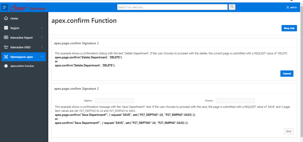 This example shows a confirmation message with the ‘Save Department?’ text. If the user chooses to proceed with the save, the page is submitted with a REQUEST value of ‘SAVE’ and 2 page item values are set, P27_DEPTNO to 10 and P27_EMPNO to 5433.