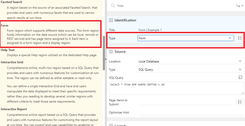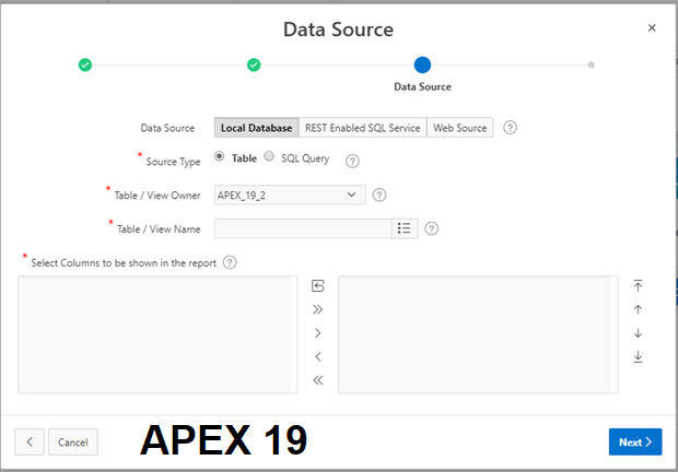 As the upgrades are also includes the source definition changes, now we have more flexibility on data source side. We can create forms on SQL, PL/SQL returning SQL Query, REST Enabled SQL, REST Services and of course on Table/ views. - Source Selection