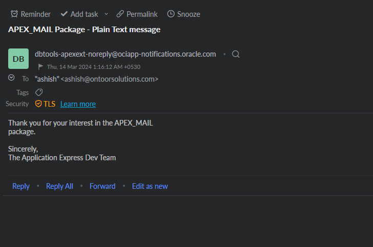 p_subj => 'APEX_MAIL Package - Plain Text message');