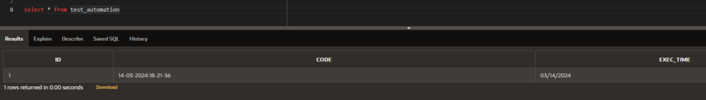 Let’s have a sample table to test APEX_AUTOMATION functions and procedures. Create a table as TEST_AUTOMATION