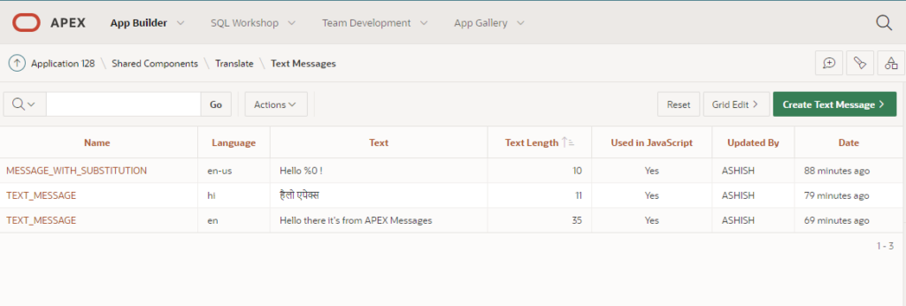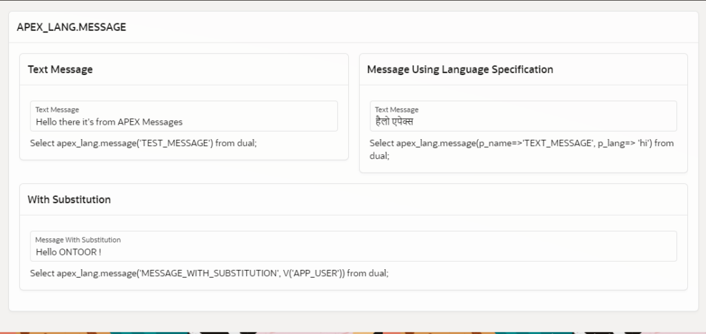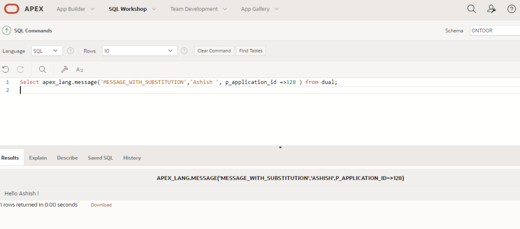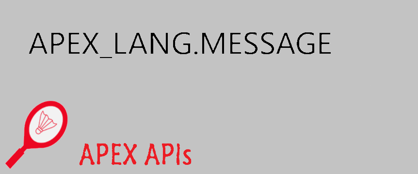Select apex_lang.message('MESSAGE_WITH_SUBSTITUTION','Ashish ', p_application_id =>128 ) from dual;