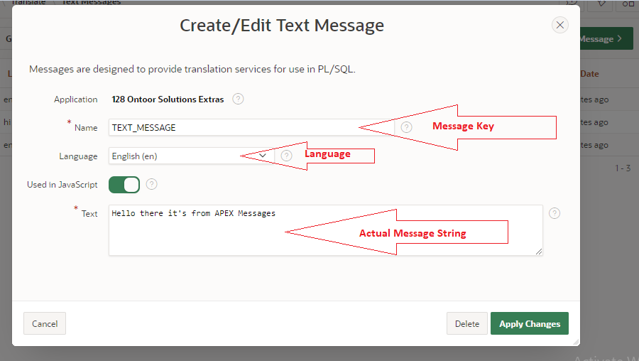 | p_application_id | Used to specify the application ID within the current workspace that owns the translated message you wish to return. Useful when coding packages that might be called outside of the scope of Oracle Application Express such as packages called from a database job. |