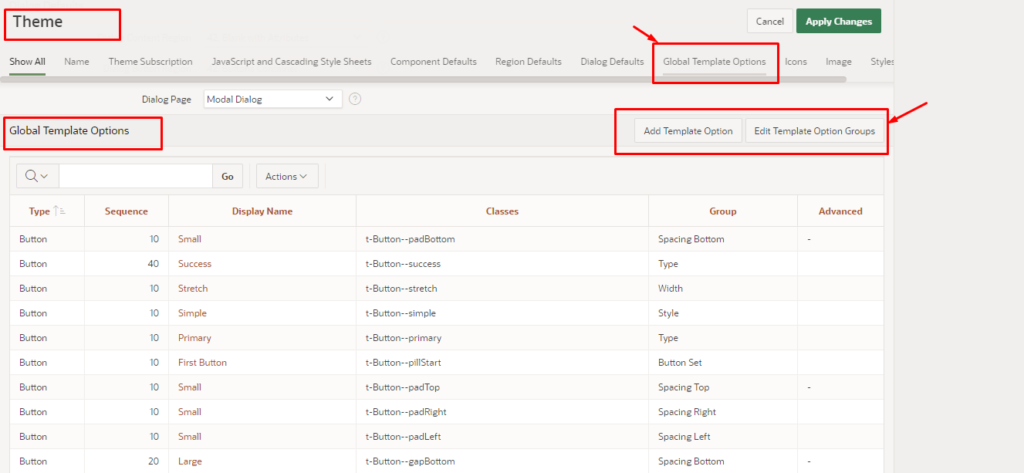 Templates are organized first by a template type and then by template class. Template types include page, region, report, list, button, label, and popup list of values (LOV). You can use template options to apply different colors or accents, different spacing and padding, and display form fields with different alignments. They reduce the need to have multiple similar templates defined in a theme.