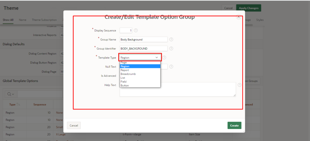 - Create/edit template Option Group here need to define group name, Identifier and Template Type as per screenshot.
