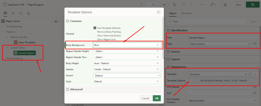 - Create a page with static region and see the template option there is body background option is coming which we have added above.