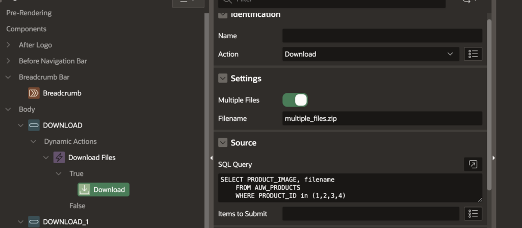 We can download multiple files as well using the download action. All we need to do is to reconfigure the file name as a zip file and query to return multiple files.