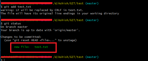$ git add test.txtwarning: LF will be replaced by CRLF in test.txt.