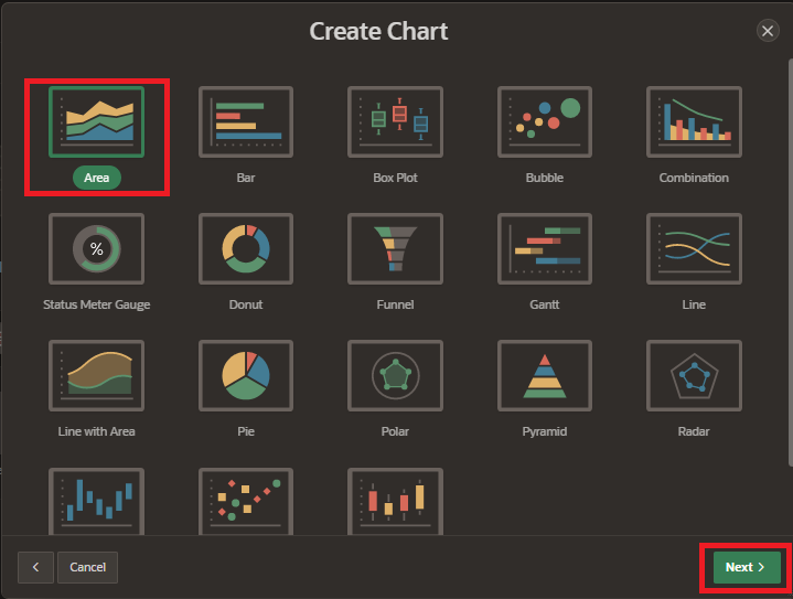 5. Select “Area Chart” from the Chart Type list. There are several types of charts available, including area charts, bar charts, pie charts, and line charts etc. and click on “Next” button.