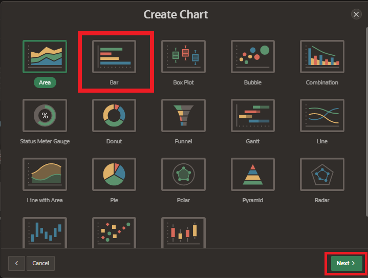 5. Select “Bar Chart” from the Chart Type list. There are several types of charts available, including area charts, bar charts, pie charts, and line charts etc. and click on “Next” button.