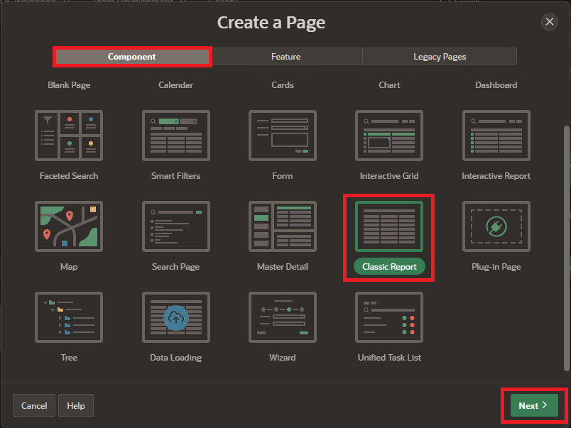 4. Select Component tab and choose the “Classic Report” option and click on “Next.”