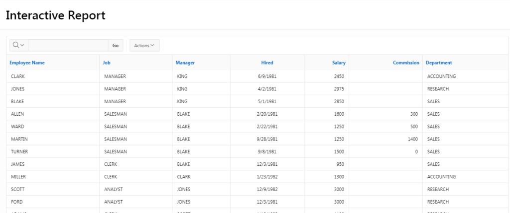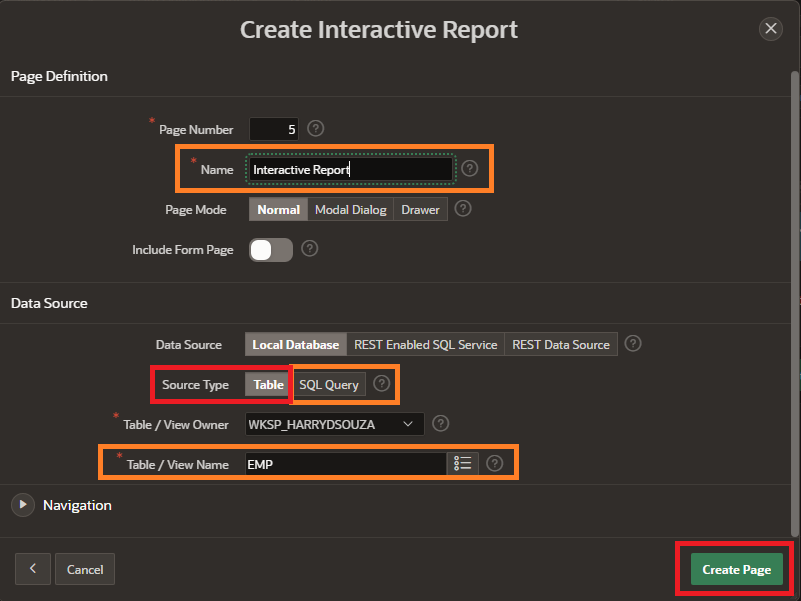 from EMP;6. Click on the “Create Page” button to create the interactive report.