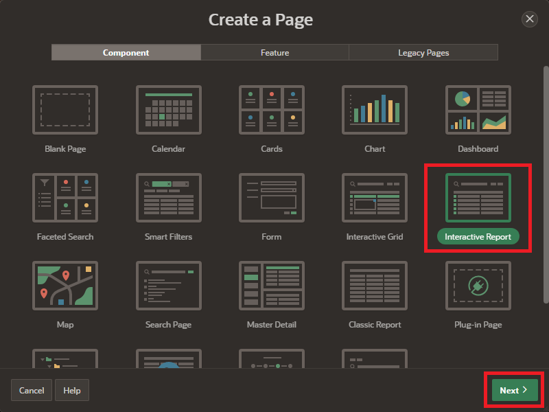 4. Select the Component tab choose the “Interactive Report” option and click on “Next.”