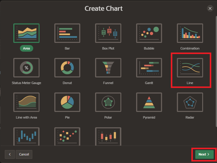 5. Select “Line Chart” from the Chart Type list. There are several types of charts available, including area charts, bar charts, pie charts, and line charts etc. and click on “Next” button.