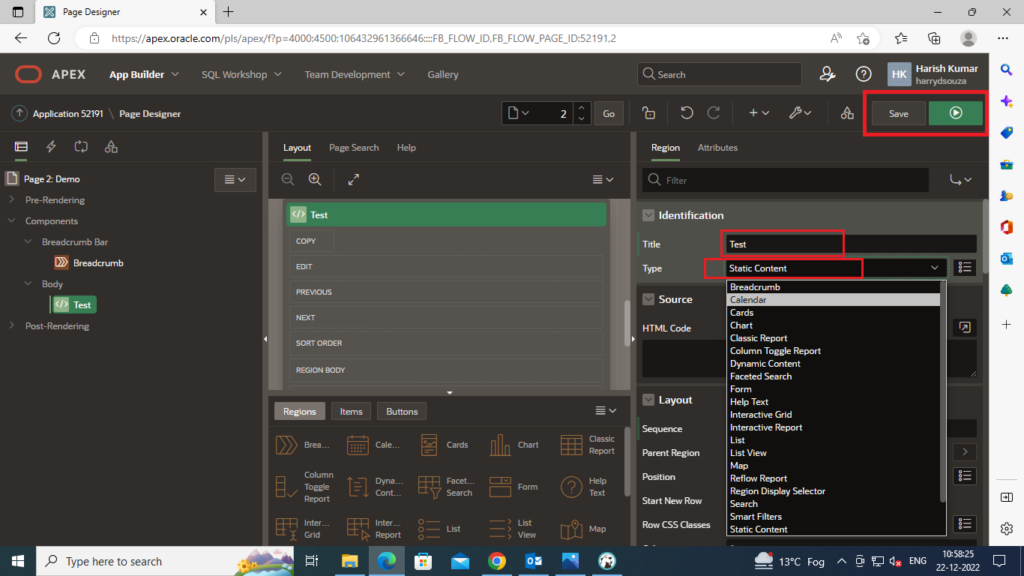 4. Enter your Page Name (Demo) and search in which you want to create a Page Region.