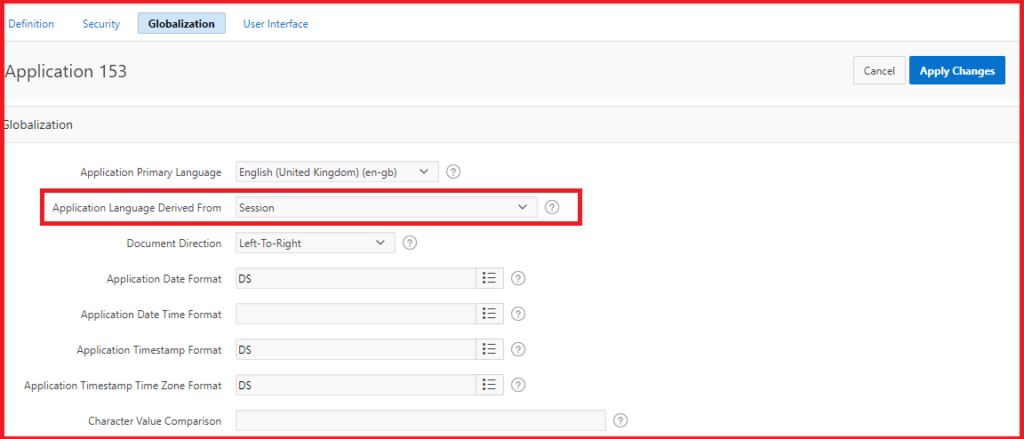 - Select “session” in the language deriving source in application globalization Application Language Derived From “Session”
