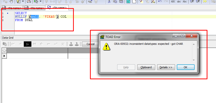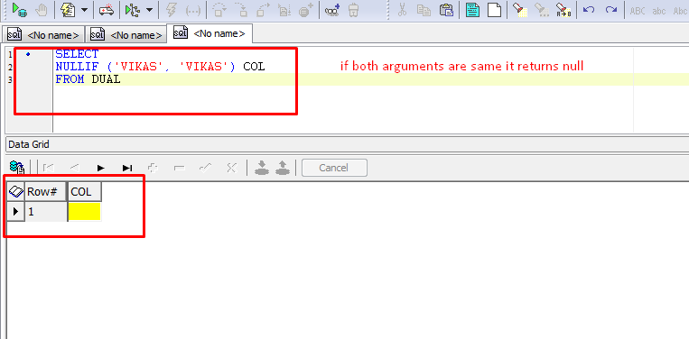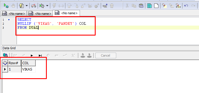 The Oracle NULLIF() function accepts only two arguments. If the both arguments are equal it returns a null value. In case the arguments are not equal, the NULLIF() function returns the first argument and if any arguments will null then function return an error.