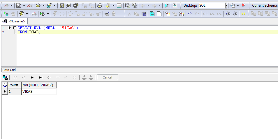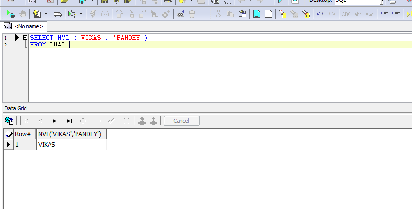 SELECT NVL (NULL, 'VIKAS') AS COL1 FROM DUAL;