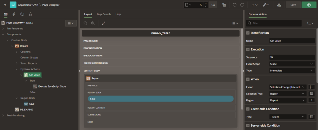 - Check if the “ENAME” value is set in the “P5_ENAME” item when the row is selected.
