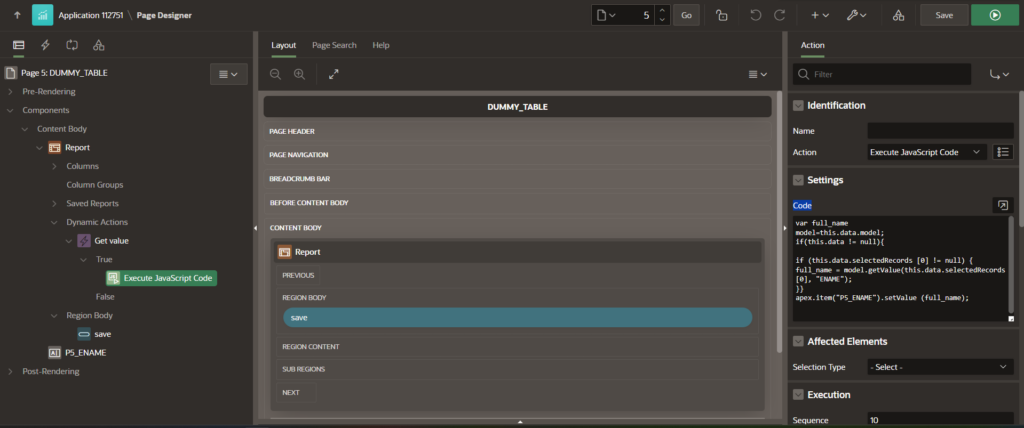 model.getValue. - Set the Retrieved Value: After retrieving the value, the code sets it to the Oracle APEX item “P5_ENAME” using