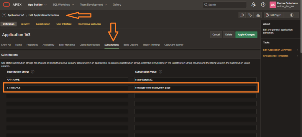 You can use substitution strings in a page template or region source to replace a character string with another value. When you design your app and allow users to edit things, you use substitution strings to pass information.