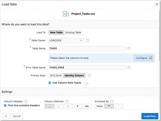 - Data Load into Existing Tables: The data upload functionality in SQL Workshop has been extended to allow uploading native Excel, CSV, XML, and JSON documents into existing tables.